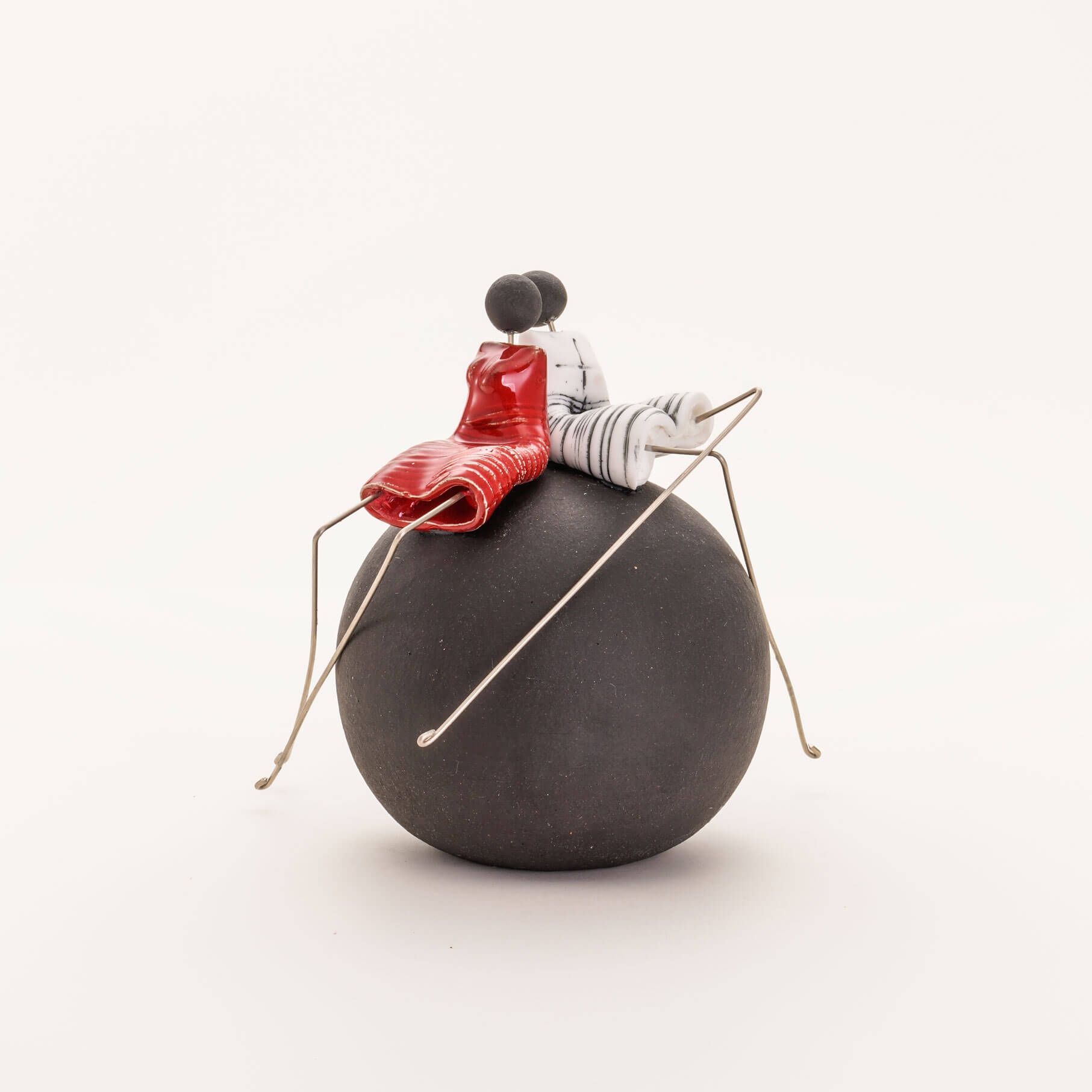 Ζευγάρι γλυπτό από πορσελάνη και κόκκινο σμάλτο σε σφαίρα από Μαύρο πηλό.
